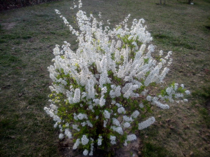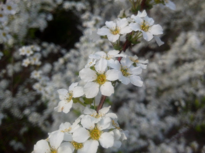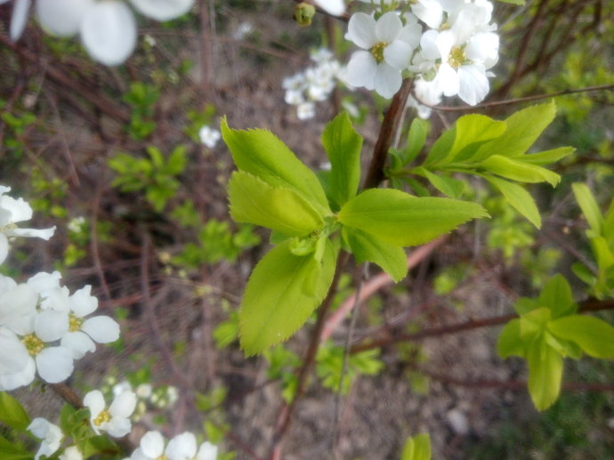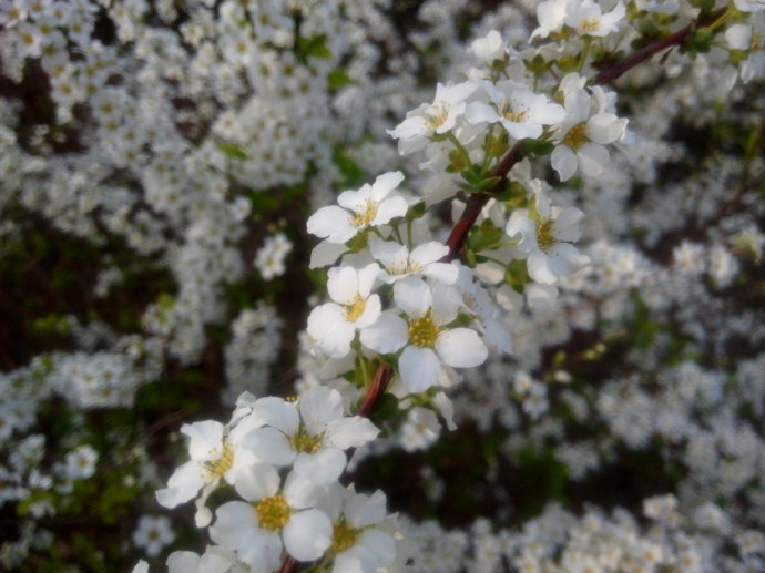 一直喜歡叫它噴雪花,而不是珍珠繡線菊什么的,它是開在萬紫千紅的春天里最熱鬧的時刻,這個時候,第一撥兒的梅花呀、玉蘭呀、杏花呀、紅葉李呀什么的已經開過去了,金鐘呀,連翹呀,還有各種的桃花、梨花、榆葉梅、海棠花……趕著趟地擁擠過來,如T臺上的選美大賽,亂哄哄的,只顧著爭奇斗艷。放眼一望,滿天滿地都是花紅柳綠,姹紫千紅,任憑你趔趄著腿兒使勁地趕著趟,眨巴著眼睛使勁地東張西望也是看不過來了,這個時候,噴雪花開了,如白雪壓枝,一片一片的,開在和煦的春風里,這是陽春里的白雪呀,那份高潔和簡約,是另類的驚艷,唬得鬧嚷嚷的百花全都噤了聲……