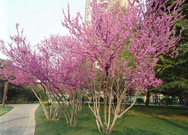 2、園林價值:叢生紫荊樹在開花的時候花朵為粉紅色或者紫紅色,而且多株苗木栽種在一起看起來生機勃勃,非常適合栽種于公園、草坪、庭院以及建筑物前,擁有非常強的綠化作用。